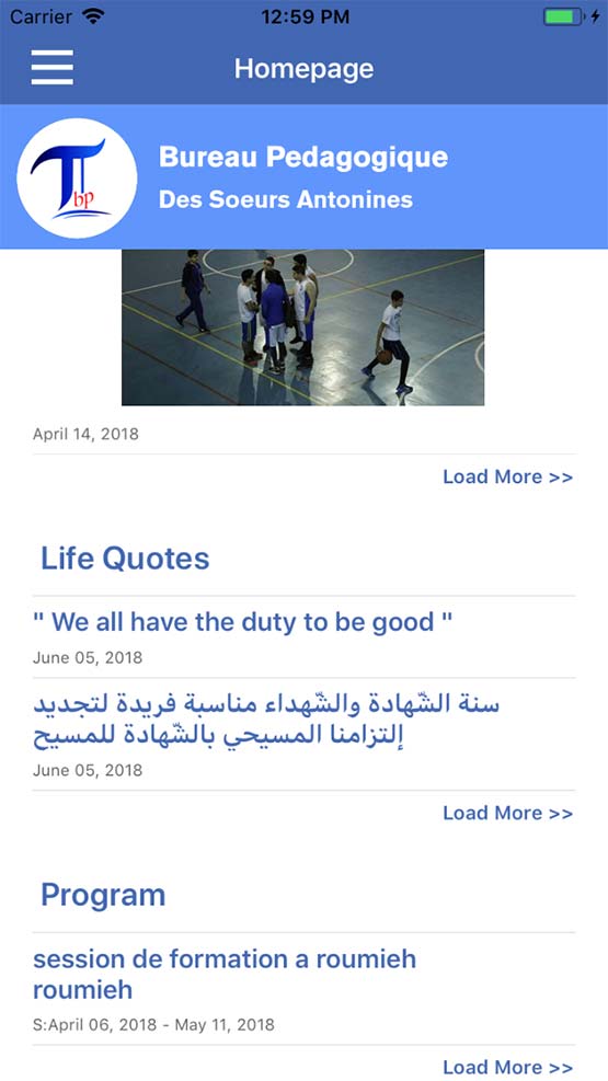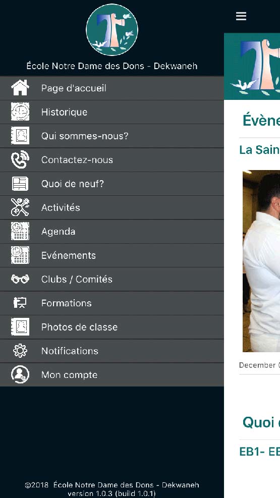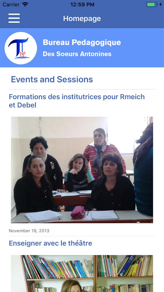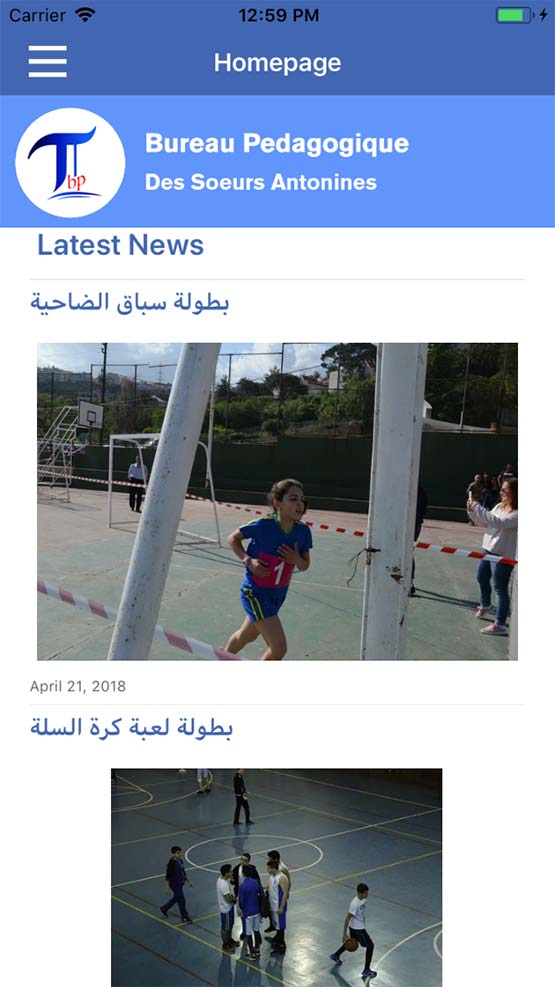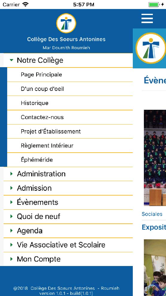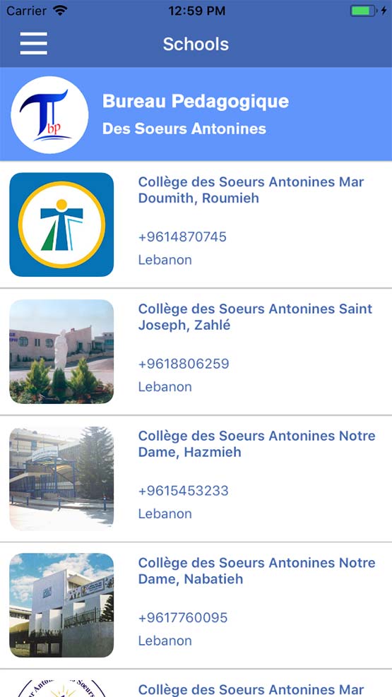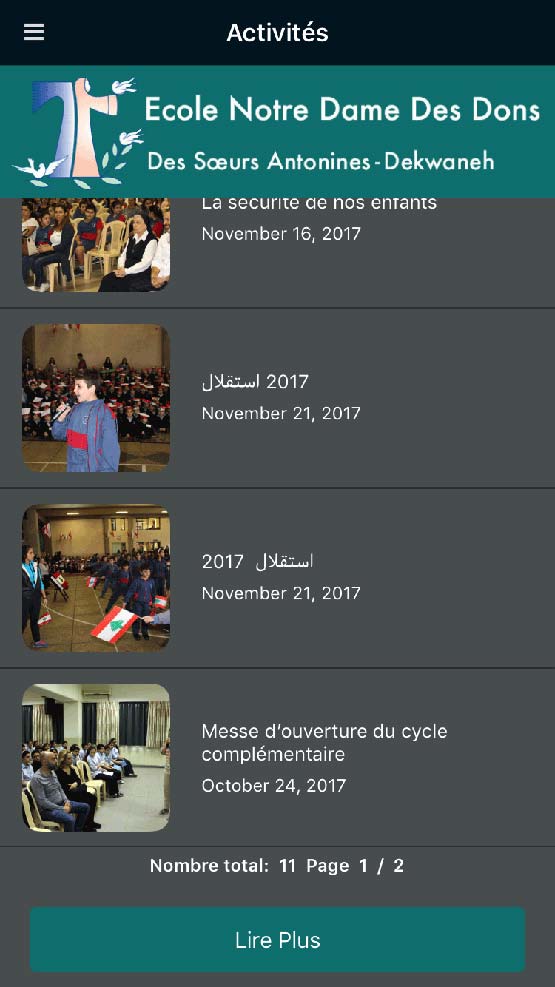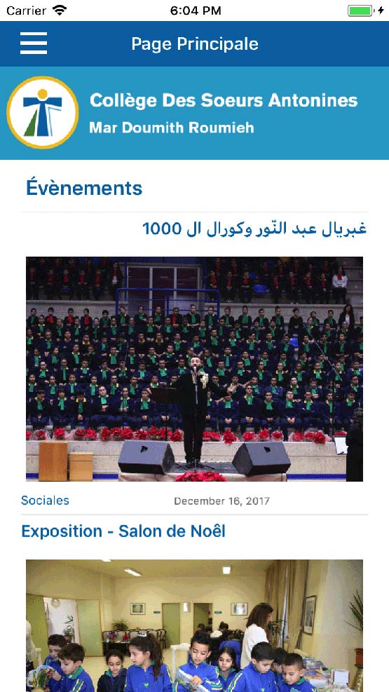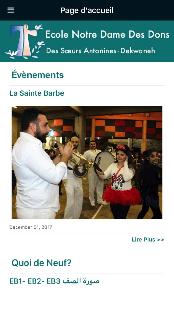 Soeurs Antonines school had an existing website. However it needed to expand its mobile app so it includes all the website sections and media publications, a key feature is an agenda integrated inside the app where the parents and students can see the daily homework and the teacher can post the tasks and the schedule. The parent's section also includes grades and financial statement.